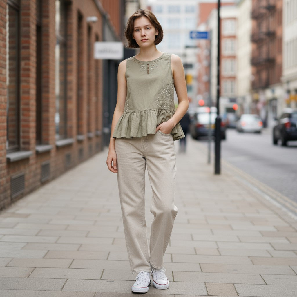 Su tono verde oliva combina con facilidad y su diseño sin mangas, con bordados florales delicados y un ligero volante inferior, aportan un toque moderno y natural.