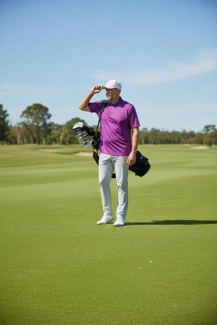 Camisa deportiva para hombre ideal para golf, en color morado con diseño moderno y textura ligera. Talla L.
