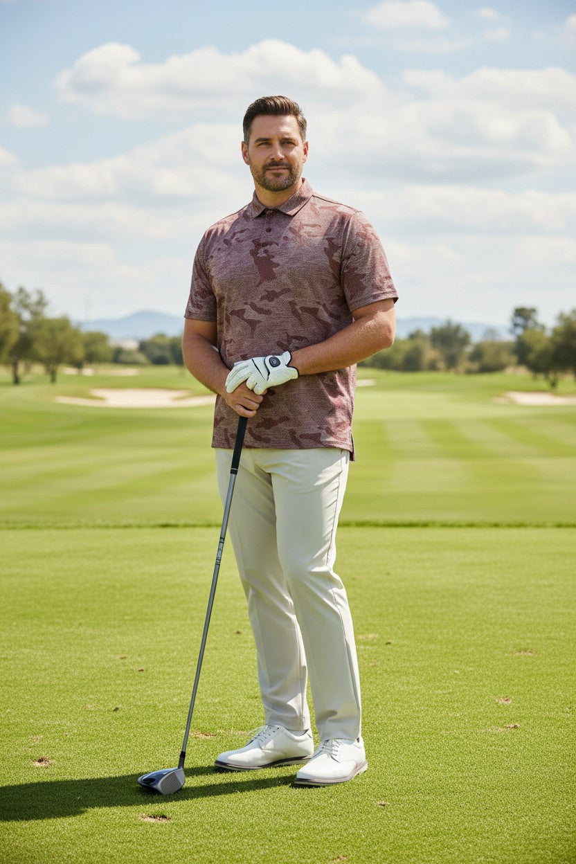 Camisa deportiva para hombre ideal para golf, en talla L y color café con diseño tipo camuflaje. Tela ligera, fresca y cómoda para jugar en cualquier clima.