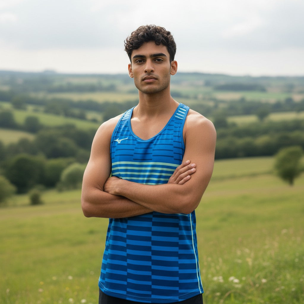 Su diseño moderno en tonos azules con líneas horizontales resalta tu look deportivo mientras el tejido ligero mantiene tu piel fresca y seca.