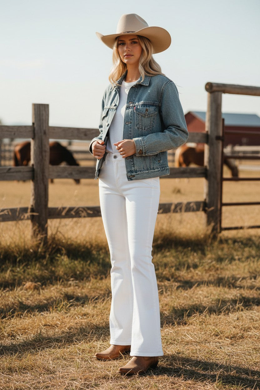 Pantalón de mezclilla para dama en color blanco, diseño con campana que estiliza y alarga la figura. Tela cómoda y de excelente calidad. Ideal para looks casuales o elegantes.