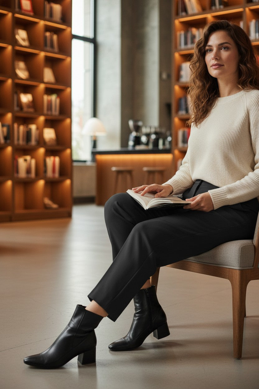 De corte recto con pliegues frontales que aportan un look moderno y estilizado. Combina fácilmente con blusas formales, tops o suéteres.